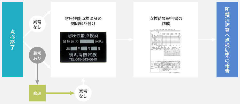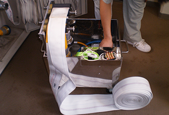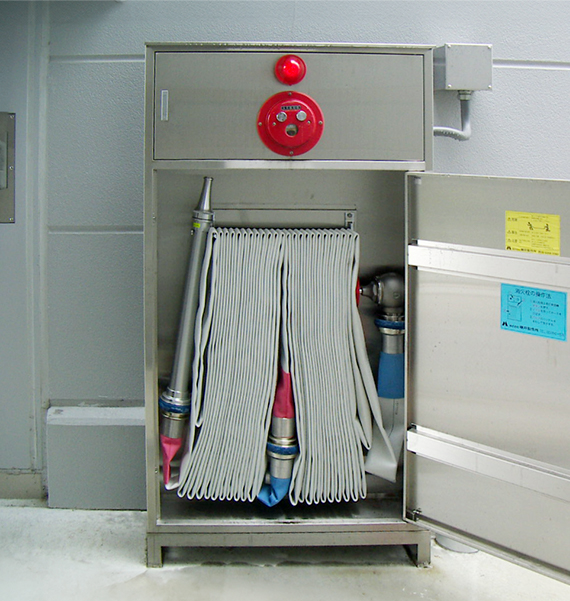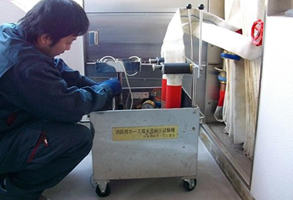 平成14年7月1日施行の消防用設備点検基準の改正に伴い、ホースの製造年から10年を経過(以後3年ごと)したものについては、ホースの「耐圧性能」を点検し、消防署へ報告することが義務づけられています。