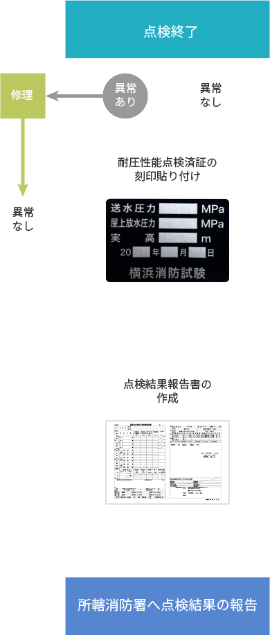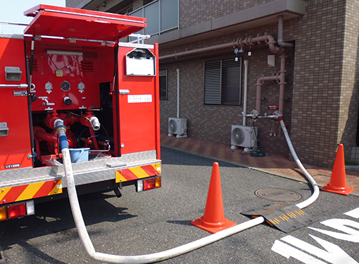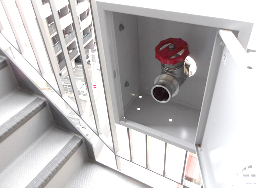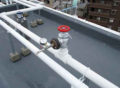 消防法の改正(平成14年3月13日公布、平成14年7月1日施行)により、連結送水管の配管及び屋内消火栓・屋外消火栓・連結送水管設備等のホースの点検事項に、耐圧性能点検が追加義務付けられました。