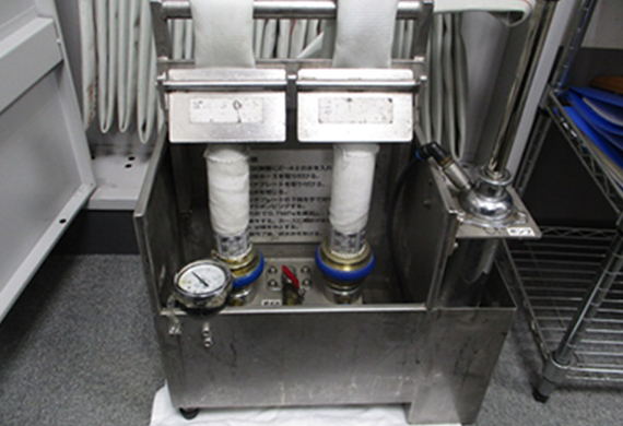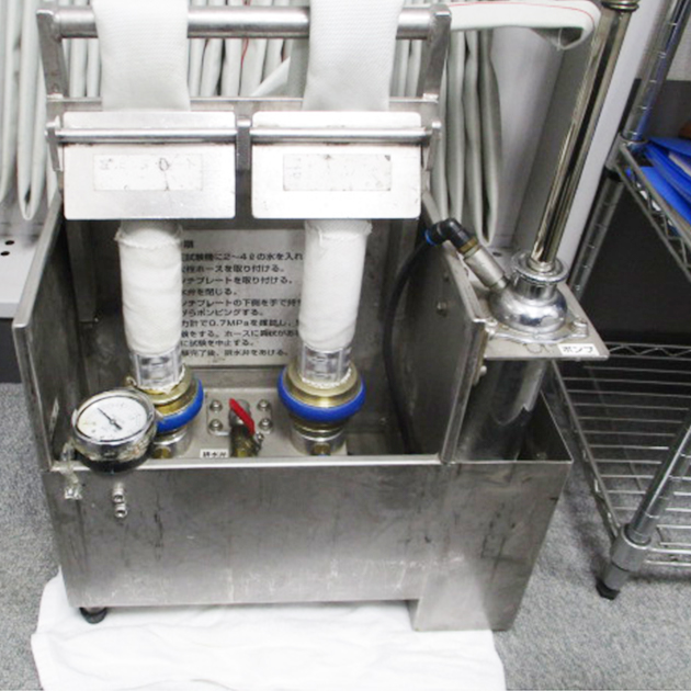 - ホースの端末部に充水し、耐圧試験機等により、所定の水圧を5分間かけて確認する。