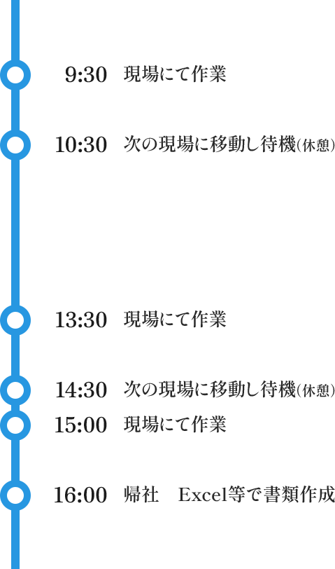 - 8:00~17:00(休憩1時間) ※現場により多少前後有